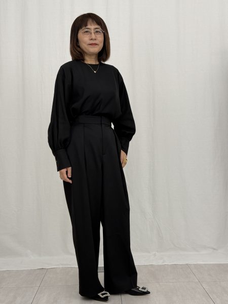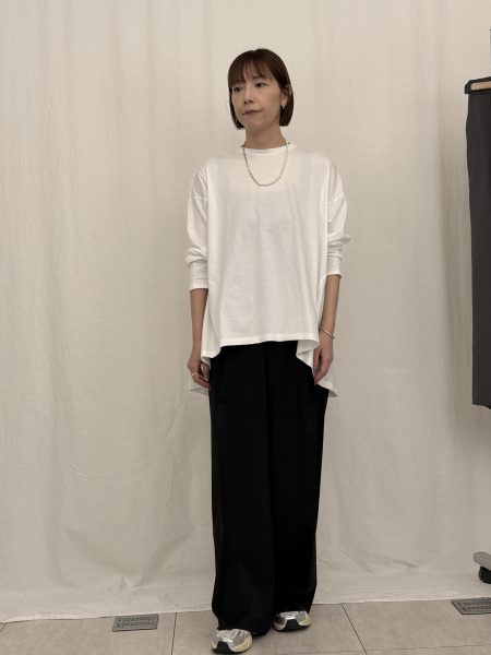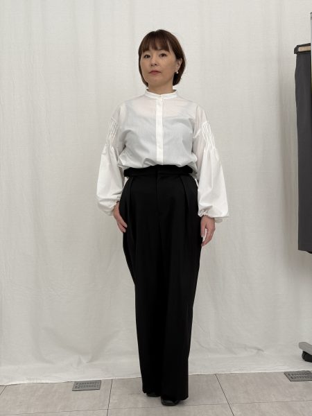トレンド感はありつつ、すっきりスタイルがよく見える絶妙なワイドシルエットを吟味。適度な張りとシャリ感のある素材は手洗い可能で乾きやすく、さらにしわになりにくいのでお手入れ簡単。