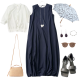 涼やかで上品な印象を与える、リネン素材のベージュオールインワンが主役のコーディネート。すっきりとしたVネックデザインが顔まわりをシャープに見せ、1枚で洗練された大人の雰囲気に。羽織として合わせたカーキのカーディガンは、軽やかな素材感でこなれ感をプラス。足元はヌーディなフラットサンダルで抜け感を演出。小物には、レオパード柄のスカーフやラタン素材のバッグなど、季節感を取り入れたアイテムをセレクト。華奢なジュエリーや色鮮やかなネイルを添えれば、ナチュラルながらも品のある夏のスタイルが完成します。リラックス感ときちんと感を両立させた、大人にこそおすすめの着こなしです。