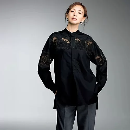 上質コットンの高密度素材に、オートクチュールにも使われるフランス産レースを胸もとから袖にかけてはめ込んだブラウス。デビューコレクションで話題を呼び、この秋冬は新色のブラックが登場。