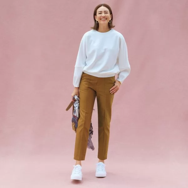 「カジュアルなのに上品でこなれて見える」と高評価のオリジナルのベイカーパンツ。大人の気になるパーツの肉感を拾わない高めに設定された腰位置と、裾に向けて細くなる計算されたテーパードシルエット。ほんのり光沢のある素材とセンターラインの効果もスタイルアップにひと役。