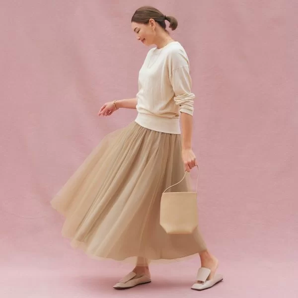 シンプルな着こなしもたちまち主役級の存在感に仕上げてくれる大ヒットスカート。人気の理由は、シルキーなスカートの上にシアーなチュールを二重にあしらった、大人にふさわしいリッチなかわいさにあり。ウエストはゴム仕様ではき心地はラクちん。重たい冬に映える新色のベージュが出ました!