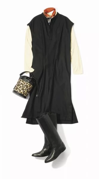 インナーに柔らかなベージュ系のニットを合わせ、足もとにはブラックのロングブーツを。きれいめにワンピースとして着れば、ほどよく上品なお出かけスタイルが完成。スキッパーの襟もとから、さりげなくプリントスカーフをのぞかせ、レオパード柄のバッグで華やぎをプラスすれば、ディナーなどにも最適。