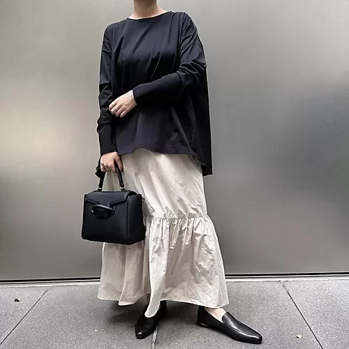 夏シーズンに半袖で人気だったバックフレアプルオーバーに長袖が登場しました!まだ暑い時期から活躍してくれる万能な1枚です。今回はインラインのオフホワイト、ブラックに加え、エクラ世代が上品に見えるオイスターカラーを別注させて頂きました。シンプルで着心地のよいカットソーと、気になる後ろ姿を華やかにカバーしてくれるうしろフレアのデザインが秀逸です