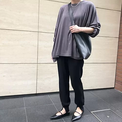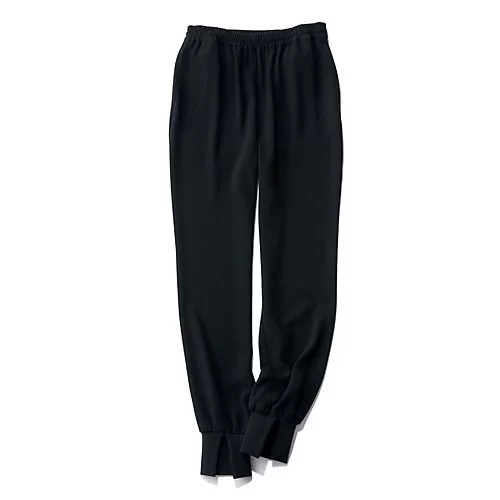 個性的な前スリットを入れた裾まわりのみ柔らかなリブ素材で、リブ上のクシュッとしたシルエットがおしゃれ。「ジャストサイズではくと細身で女らしく、ゆるめではくとスポーティな印象に仕上がる」と、サイズ違いで複数買いする人も多い大人気パンツ。サイズ34はエクラの別注。肌ざわりのいい素材に加え、ウエストはゴムだからはき心地がとてもラク!