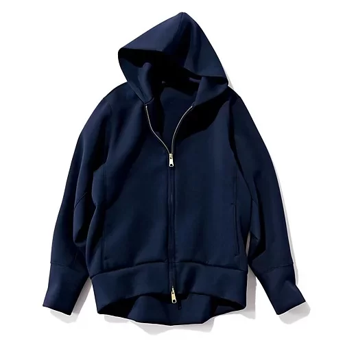 一度着たら手放せないと話題のパーカから、新色のネイビーがお目見え。張り感と光沢感のある軽やかなダンボールニット素材は、大人の体を立体的に美しく見せてくれる。カジュアルになりすぎないリッチなゴールドの金具も魅力。