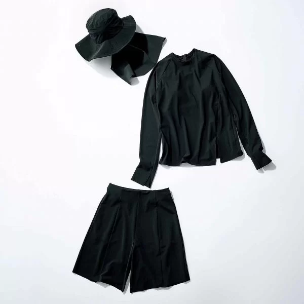 水着とは別に、ラッシュガードやショートパンツなどあれこれそろえるのが面倒だという声に応え、これさえあればコーディネートが完結するセットアップが登場。“水着のままコンビニに立ち寄れる”をコンセプトにしており、リゾート地ではラウンジウエアとして、さらに上下別々でアウトドアシーンなどでも使える汎用性の高いデザインが魅力。UVケアハットは、昨年は早い時期に完売してしまった超人気モデル。ツバが広いので、顔の日焼けをしっかり予防。さらに気になる首まわりだけでなく、肩先まで届く長くて大きなシェードがついているのは水着シーンを想定したこのブランドならでは。このセットがあれば、安心して初夏から真夏まで過ごせそう!