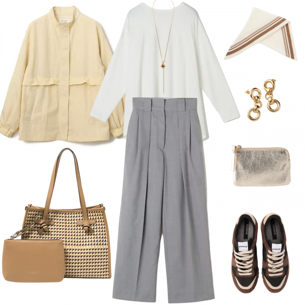 はくだけで華やかさと女らしさを放つ鮮やかなイエローのリネンスカート。ほどよいボリューム感のフレアシルエットがスタイルアップ効果を発揮する主役級の一枚に合わせたのは、朝晩はまだ肌寒さが残るこの時期に手放せない薄軽ブルゾン。お気に入りのカフェのテラス席で、夫とのランチデートをエンジョイ!