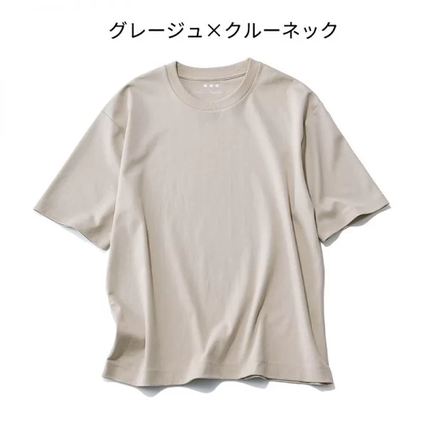 ネック違いの白2枚組だった従来品から、クルーネックをグレージュで別注。しなやかなスーピマコットンを使用し、適度な張りと柔らかな肌ざわりが両立。白でも透けにくく安心して着られる。カジュアルになりすぎないから、さまざまなスタイルに合う。