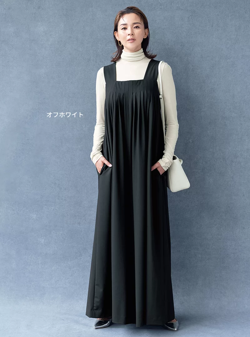 たっぷりとしたドレープがきれいに揺れる、フルレングスのオールインワン。カジュアルでありながら、しっとりとした光沢感のあるウールで仕立てることで、ぐっと上品な雰囲気に。