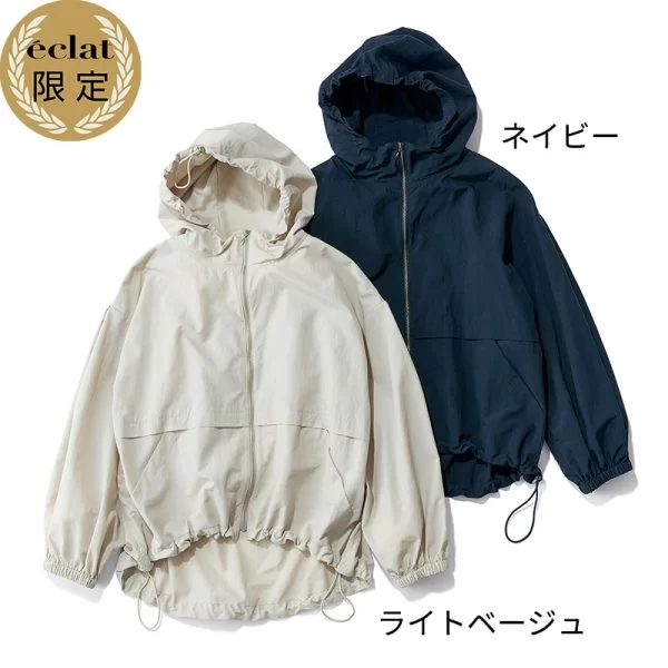 後ろ下がりで少し丸みのあるシルエットやふんわり袖など、スポーティなブルゾンを女性らしくアレンジ。弱撥水や防しわ、紫外線カットなどの高機能素材を使用。