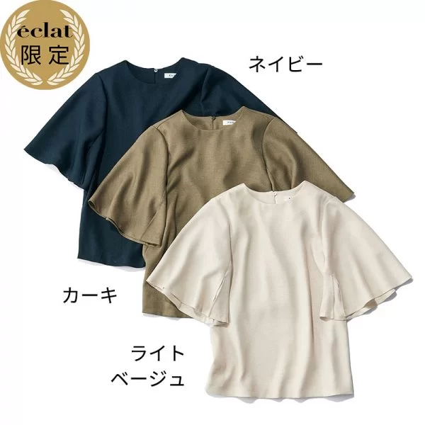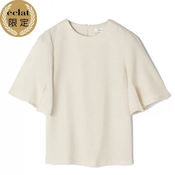 シンプルな丸首の身頃をベースに、ドレープがきれいなフレア袖がポイント。コンパクトな着丈で、トップスアウトがバランスよく決まるので着こなしに迷わない。