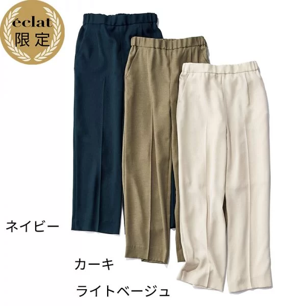 きれいめにもカジュアルにも着回しやすい、ほどよいワイドシルエットが大人に似合う理由。しわになりにくいので立ったり座ったりを繰り返してもきれいをキープ。