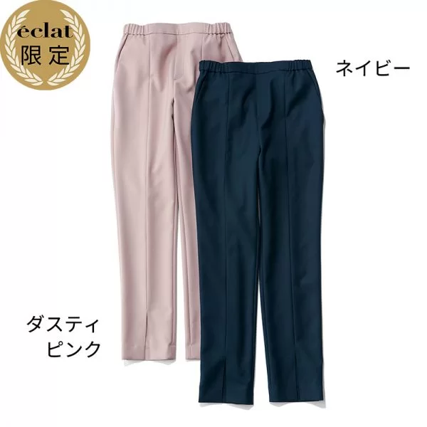 ほんのり広がるフレアシルエットの裾スリットと、そこからつながるセンターの切り替え線で脚全体がほっそり! ほどよいストレッチで、ノーストレスな着心地。