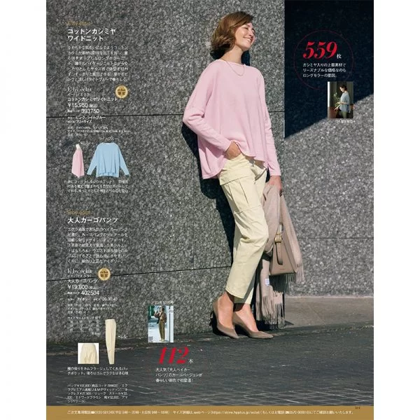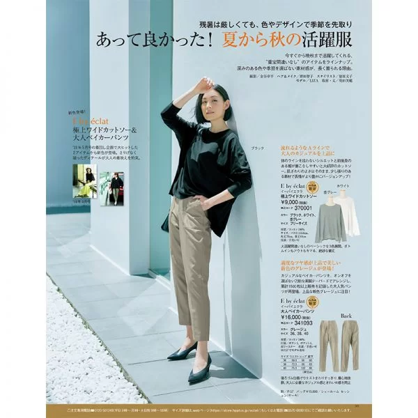 エクラプレミアムで大人気を誇るベイカーパンツにカーゴの仕様をトッピングし、よりカジュアルに進化。細見えがかなうと評判の美シルエットや、ウエストの後ろのみゴム仕様にした快適なはき心地もうれしい。