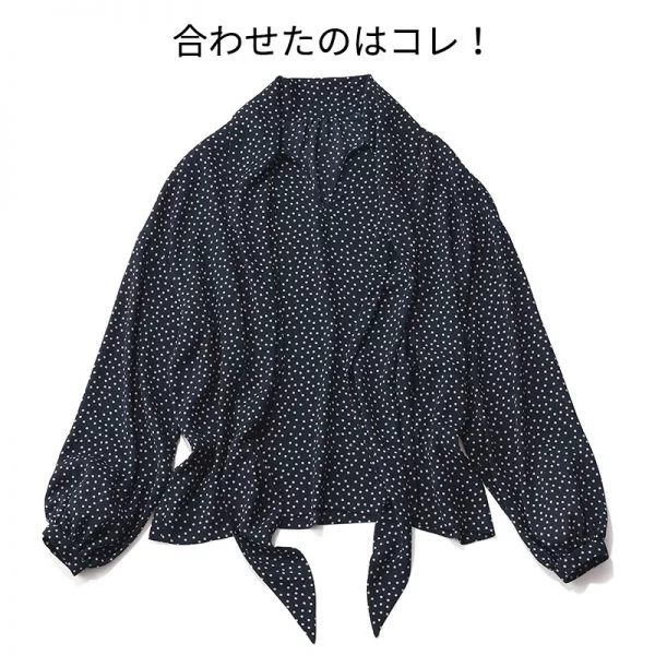 ネイビーベースにピンクのドットを施した、ほどよく甘い大人のためのブラウス