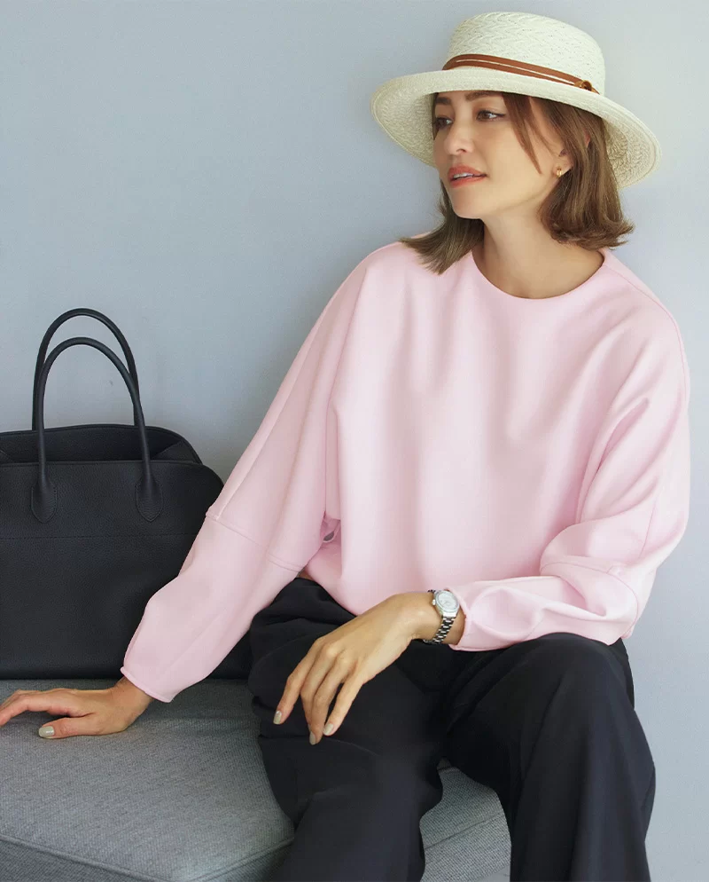ブラウスのようなたたずまいで、ラクちんなのに上品なムードをたたえた新作スウェット。布帛のような表情は、ほどよく張りのあるジャージー素材。ボリューム袖は切り替えを施した構築的なデザインで、少しシャープな印象に。