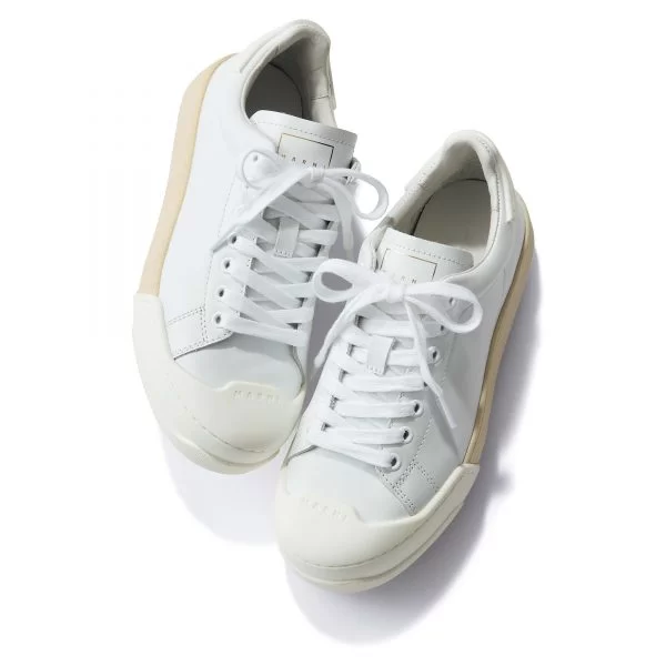 色鮮やかな服からベーシックカラーの服まで、どんな着こなしにも合わせやすいオールホワイトと、コロンとしたフォルムがかわいらしい。つま先とかかとに型押しされたMARNIのロゴが特別感を演出。