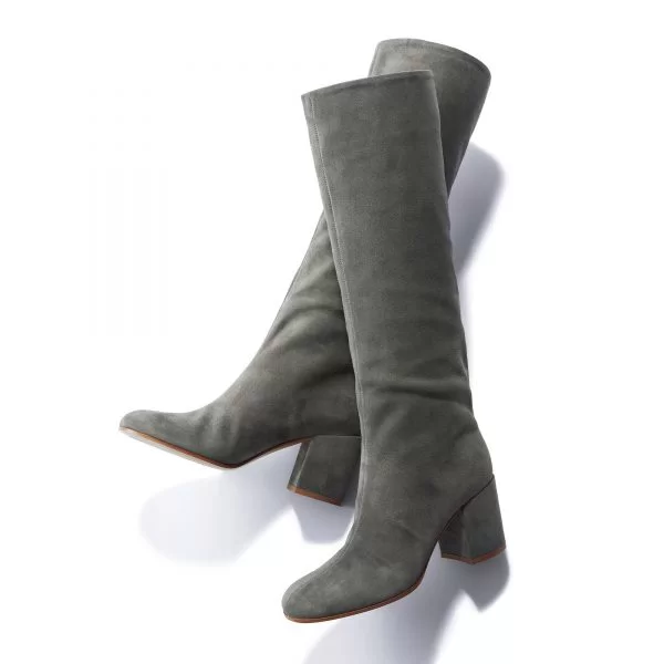 ほどよくゆとりのあるロングブーツは、しなやかなスエード素材だから履き心地がよく疲れにくい。ファスナーがないプルオンスタイルだから脚をまっすぐ美脚に見せてくれる。ブロックヒールで安定感も抜群。