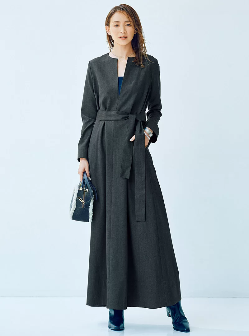 ウールツイル素材で秋冬に活躍する一枚。肩まわりをコンパクトに設計し、身頃にゆとりをもたせたメリハリのあるシルエット。裾にかけてフレアが美しく広がることで、ぐっと脚長に見せてくれる効果も。