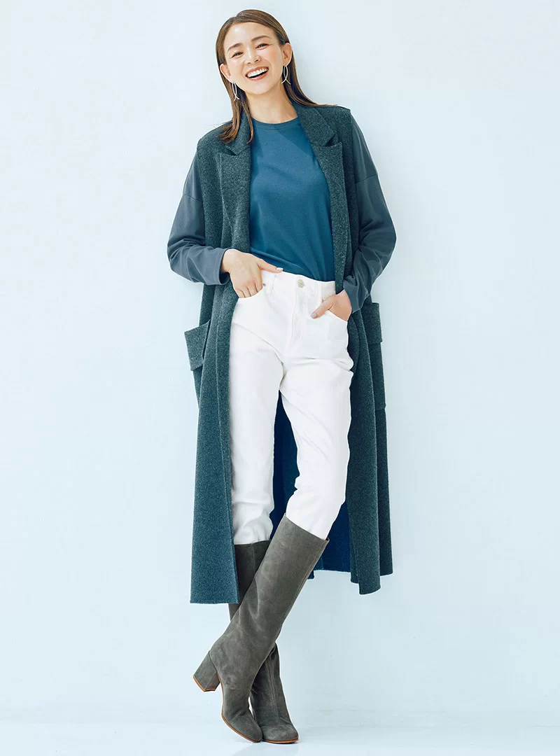 ジャケットほど堅苦しくなく、一般的なカーディガンよりもしっかりとした厚手でこなれ感たっぷり。大粒のパールが並ぶ襟ぐりから前立てと、ラフに仕上げた袖口や裾のコントラストが遊び心たっぷり。