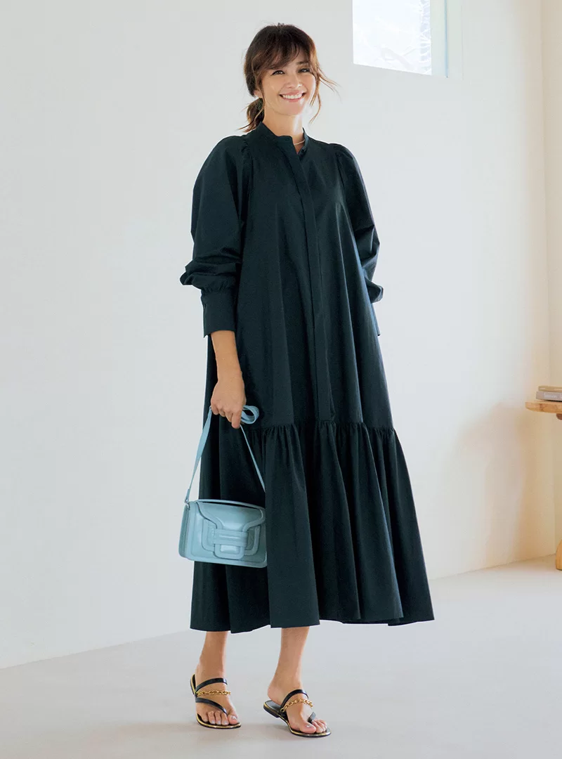 端正なバンドカラーとティアードの