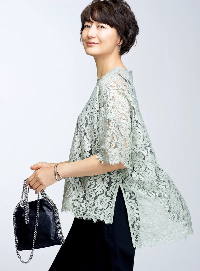 フォーマルにも着られるスペシャルなアイテムが そろう「Room no.8 BLACK」。ロマンチックな リバーレースが華やかなトップスは、デニムなどを 合わせてランクアップした日常着に。さらには 秋冬の特別なドレスアップシーンにも大活躍!