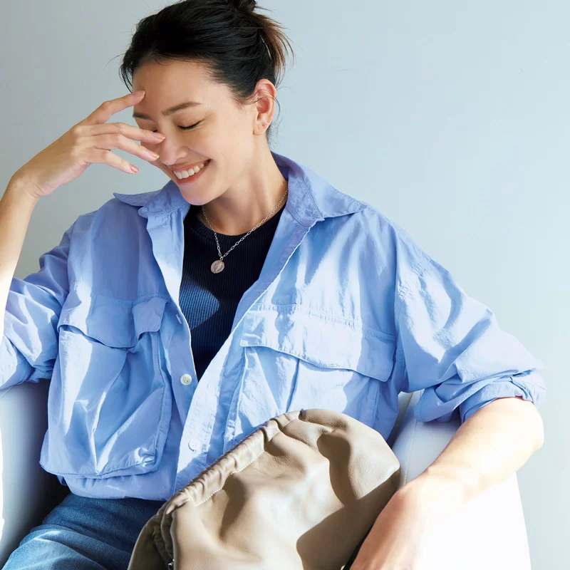 「もともとメンズの商品だったものを女性が着やすいよう着丈を少し短く、ちょうどいいゆとりあるサイズ感で別注しました。特にブルーの色みには何度もサンプルをやり直すほどこだわり、結果大満足の一枚に。カーディガン感覚でラフにはおると立体感が出て体型カバーもでき、胸にあしらった大きなポケットがトップの位置もごまかしてくれる効果があります」(徳原さん)