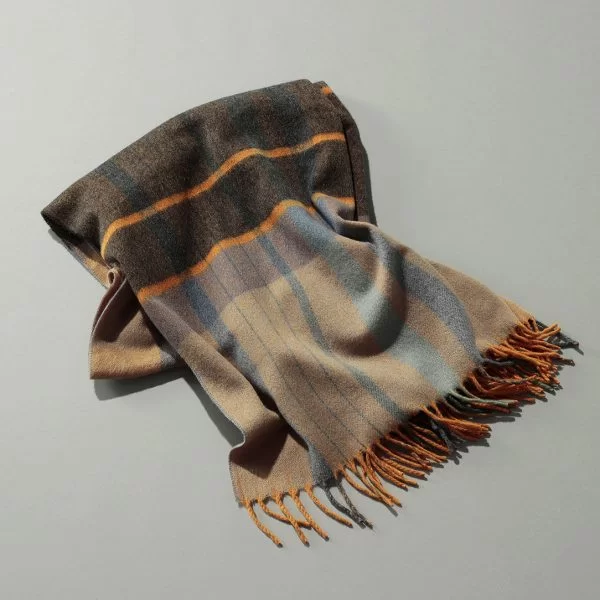 熟練した職人が手がけ、生地密度が高く丁寧な起毛が施されたカシミヤストールに定評のあるJoshua Ellis。シックなブラウンに柔らかなブルーの色味が混ざったチェック柄は新鮮な組み合わせ。淡い色合いでスタイリングを柔和してくれそう。