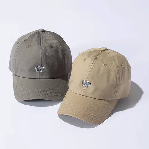 サイの刺繍アップリケがワンポイントで施された茶目っけのあるキャップ。バッグはアジャスター仕様でサイズの調整が可能なので、パートナーとシェアして使うことも可能。ありそうでないチノ素材は、カジュアルスタイルにはもちろん、トレンチコートなどトラッドなアウターを着たときにもなじみがよく重宝します。