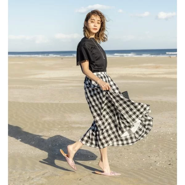 前はストレートに近い台形、後ろはひざ上から2本のタックプリーツ入り。細身だけど前後の可動域が広いので歩きやすい。裾プリーツの動きでヒップラインが美しく立体的に見えるのもうれしい。