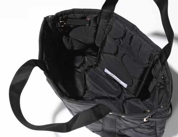 エレガントな佇まいのナイロントートは、ふんわり軽いキルティング素材とベルテッドデザインが特徴的。とにかく軽くて物がたっぷり入るので、きちんと感が必要なイベントや、ジムやレジャーの際のおしゃれバッグとしても役立ちます。