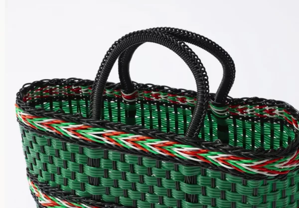しっかりと編み込まれた太めの持ち手はとにかく丈夫!グリーン×レッドのカラフル色を、持ち手やトリミングの黒がピリッと引き締め大人っぽさをプラス。