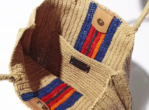 ナチュラル感のあるラフィア素材に、センスの良いカラーコンビのストライプ柄とビットが付いた、こなれ感満載のデザイン。レザーが施された持ち手など、ディテールにもこだわった大人が満足できるかごバッグです。