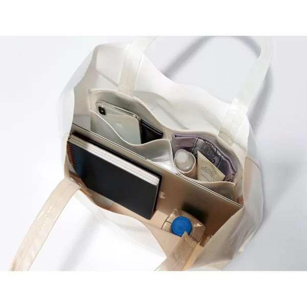 底のみ立体的になっているので、ノートパソコン、書類、ペットボトルなど、かさばる荷物も収納できます。内側には小さな2つのポケットが付きで、細々としたものの整理もしやすい。