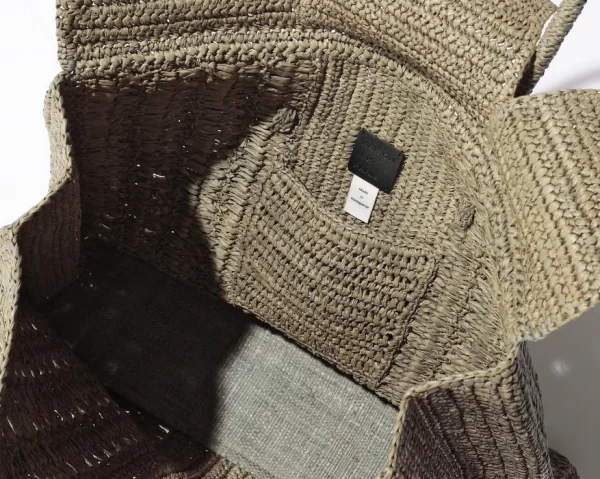 天然のラフィア素材のリラックス感とフラップ付きのきちんと感がバランスのよい一品。さまざまな編み目がアクセントになり、一般的なラフィアバッグとは一線を画すエレガントな雰囲気に。持ち手が長いので肩にも掛けられます。