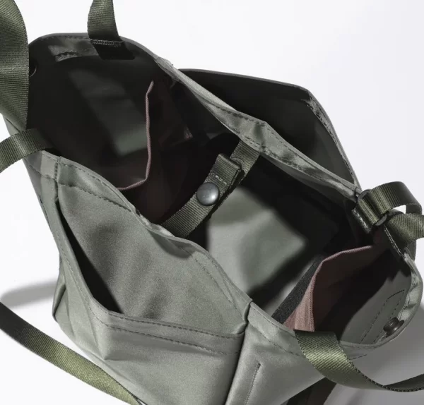 小ぶりなのでトートバッグとして持つと可愛らしい雰囲気になり、クロスボディにすると軽やかでスポーティなムードに変身。落ち着いたカーキ色がシックなパンツルックにセンス良くなじみます。
