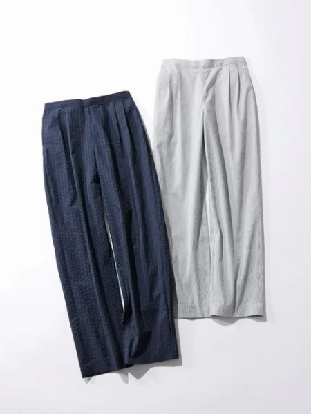 世界的に知られるインビスタ社の吸水速乾性のあるシアサッカー素材は、夏に心地よいひんやりとした肌触りが特徴。ウエストゴム仕様のゆったりしたイージーシルエットでありながら、裾に向かって細くなる美脚効果のあるストレートパンツ。お腹回りとヒップにゆとりがあるので、体型を選ばず着られます。