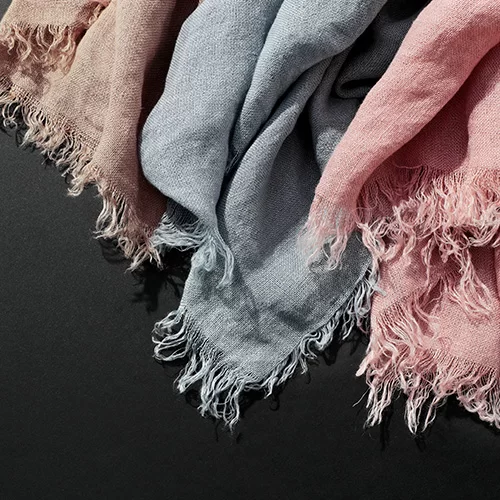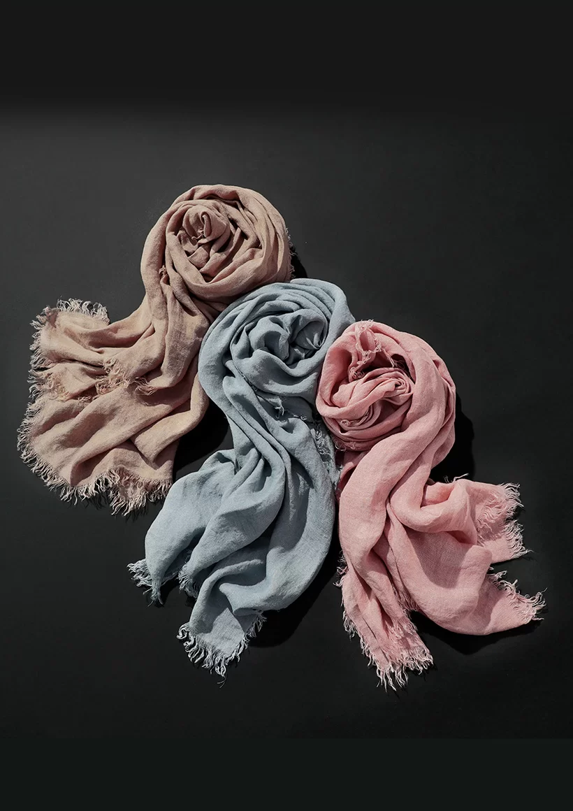 シーズンレスに使えるリネン素材でも、これだけの分量があれば秋冬もあたたか。フランダースリネンのやわらかな風合いのおかげで、無造作に巻くだけでサマになります。オールホワイトコーディネートに親しみと暖かさを添えるニュアンスピンクは、肌馴染みもよく使いやすいので、一枚持っておくと便利。端のフリンジ加工のおかげで、顔まわりもぱっと華やかな印象に。