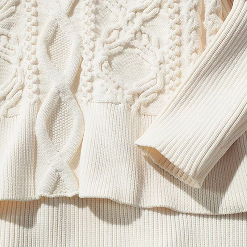 裾や袖、また脇下はシンプルなリブにすることでボリュームダウン。ケーブル編みニット特有のもたつきを解消した日常に着やすいデザイン。