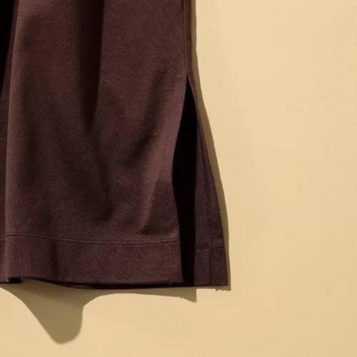 足捌きを考えて裾には控えめにスリットを入れました。パンツと重ねたときも動きと軽さが出るよう計算した絶妙な深さ。