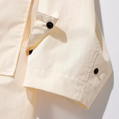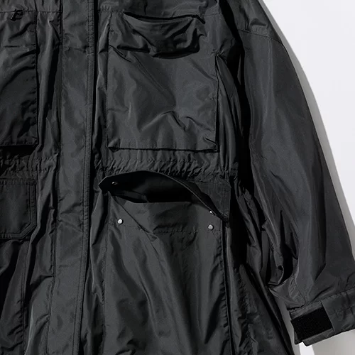 リサイクルナイロンを使用し、環境に優しい非フッ素の撥水加工を施したサステナブルなミドル丈アウター。ミニマルな中にも、フラップ付きのスクエアポケットや、わずかに前後差のついたシルエットとトレンドの要素も盛り込んだ今年らしい一着。裾のドローストリングを絞ればコクーンのようなフォルムになり、また違ったスタイルを楽しめます。