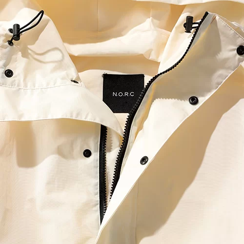 イエローよりのオフホワイト生地との対比で、モードなツートンカラーを作り出すマットな黒金具。首元のドローストリングを閉めれば、フードが顔に沿うようにフィット。