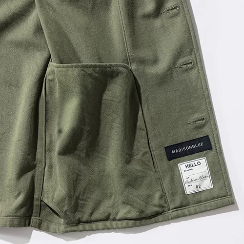 毎年即完売になる、マディソンのエッセンシャルラインにも名を連ねるミリタリーアウター「MARRAKESH」。金色の糸を用いて刺繍したワッペンが、階級章を思わせる本格派デザインです。大きすぎず体にフィットするシルエットなので、ラフになりすぎないのも好印象。前後差がないシャツ型は、ボタンダウンしてトップスとして着ても、羽織りとして着てもOKな汎用性の高いアイテムで一枚持っていると重宝します。このタイプには珍しいサイドポケット付きなのも便利。