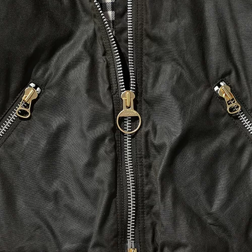 インダストリアルで無骨な雰囲気がありつつ、シルバーとゴールドがミックスされておりジュエリー合わせもしやすいジッパー。フロントのジッパーはリング状になっていて、手袋をしたままでも開け閉めしやすい配慮がなされています。