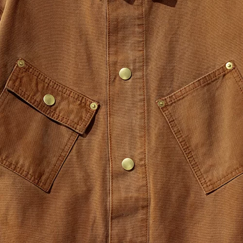 同色異素材のスクエアポケットを片胸に付け、機能性とデザイン性をアップ。ファスナー付きなので、こまごまとしたものを入れるのにも便利。