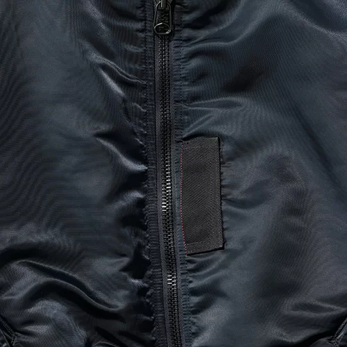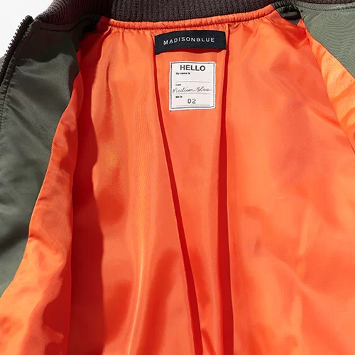 フライトジャケットのリアルヴィンテージに忠実に、裏地はエマージェンシーカラーの生地をセレクト。前を開けて着たときにちらっと見える程度の絶妙な配分で、アクセントカラーとしても有効です。