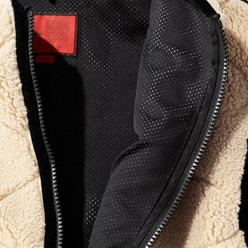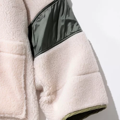 肘部分をカーキのパネルにすることで、デザイン性を高めるだけでなく腕の曲げ伸ばしをしやすくした一挙両得な仕様。ボアの柔らかな風合いをピリッと引き締めて。