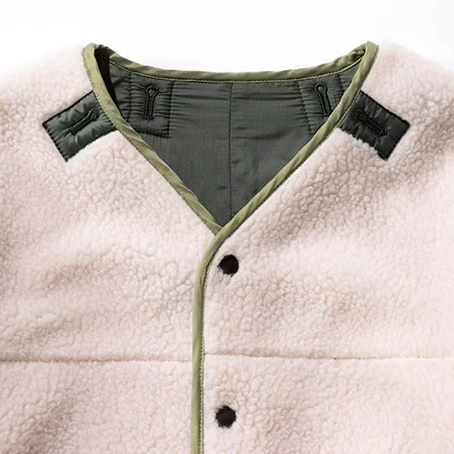 毎年人気ゆえ、デザインを少しずつ更新し、今シーズンも続投なJANE SMITHの定番アイテム。表面はボア×カーキ、裏面はカーキの単色と、一枚持っていると着こなしの幅が広がるリバーシブル仕様。スポーティなアイテムながら、ボタンダウンやすっきりしたVネックのノーカラーでキレイめなファッションにもマッチします。裏面は肘部分のシャカっとしたポリエステル生地が一面を覆い、よりミニマルな印象。