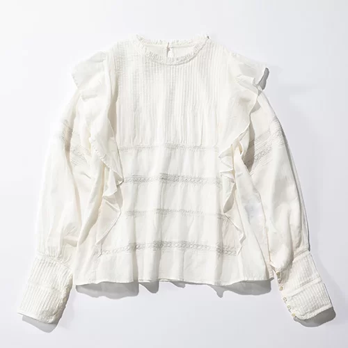 胸元に斜めに配したポケットがさりげなくV字を描き、ボリュームが出がちなバスト部分を細く華奢に見せてくれる効果が。左右でポケットのディテールが異なっているのも心憎い。