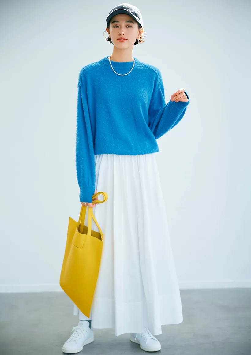 一見シンプルなハイネックニット。だけど着るだけでこなれ感が漂うのはワイド&長めの袖とリブのデザインのおかげ。デニムにも、旬のナロースカートにも。アイボリーはボトムスを選ばない万能カラー。一歩進んだ着こなしを目指すなら、おすすめしたいのはトップ+ボトムのセットアップのスタイリング。バッグやアクセサリーなど、小物使いで印象を変えられるのも魅力。